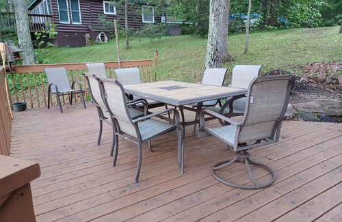 The large deck overlooks the lake with plenty of seating and views of the kids swimming or fishing. We have a big lily pad for the kids to play. There seating around the fire pit or watching the sun set over the lake. There is a large gas grill for use of barbequing.