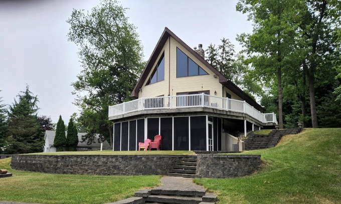 This home has all amenities, Viking Stove, 2 refrigerators, 4 TV's, WiFi, Internet, Propane Grill, and plenty of seating. The Pontoon is optional to rent. You're also isolated, meaning a forest to the left, and you won't even see the neighbor to the right. How about a huge grass area leading to the lake and of course, a fire pit.