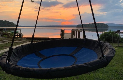 The host also owns a one bedroom cabin that is located next door, and it is also available on VRBO. The large backyard is shared between the two places. The backyard is not fenced off. Each house has its own dock and gas grill, but the fire pit, tree swing and 55 foot zip line are shared.