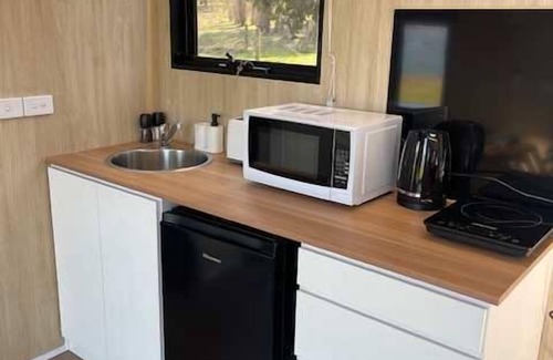 A comfortable, 139-square-foot accommodation is set in one of the best tiny house rentals and serene locations with abundant natural bushland, easy access to water, split air conditioning, a kitchenette, cooking equipment, and excellent bathroom facilities. These amenities include an eco-friendly cassette toilet with a removable waste holding tank, hand basin, and shower (gas-heated for hot showers).