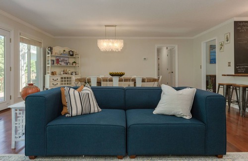 This charming vacation home's tasteful nautical-inspired decor and beautiful gardens make it a memorable destination for a dreamy Lake James getaway. Come back from the Lake to a large house with four bedrooms and 3 bathrooms spread on two levels. There is a large master bedroom on the main floor with sliding glass doors that open out to the deck and an on-suite bath. The second bedroom on the main floor sleeps 4 guests, with a queen-size bed and a twin bunk. There is also a separate guest bathroom conveniently on the main floor. At the lower level, there are 2 bedrooms with an adjoining bathroom. The second living area downstairs features a kitchenette, a large flat-screen TV, with Roku streaming options, a pool table, and plenty of lounging space for the whole family.