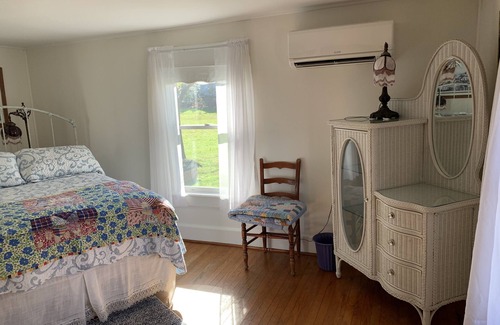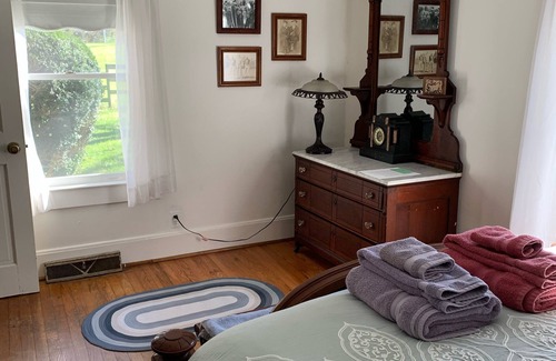 This historic farmhouse is located in a picturesque country setting. Minimum rental period is 3 months. The location is on the winery circuit next door to South Creek Winery, and about 10 minutes or so from Silver Fork Winery. The home was built in the early 1900's from wood obtained from this farm tract. There was a civil war era cabin at the current home location where Daniel's great-grandparents, Adolphus Rowe & Annie Rowe Simmons, lived and some of the floor joists were kept and utilized when the home was built. Adolphus is the oval picture closest to the master bedroom and we are looking for a good picture of Annie Simmons. Daniel's granddad married his grandmother Anna Bowman, and her dad, Daniel's great grandfather Sam Bowman, is the oval picture to the left of the Adolphus picture. Anna Bowman is seen in a picture holding Daniel at the top of the steps. Daniel's 2nd cousin, Lewis Guy Flack, is in a picture on the fireplace mantle. He was the first casualty/death during WW2 from McDowell County. Daniel's uncle cline is the framed portrait picture in the living room. He is also seen in the master bedroom in the iconic picture with Dwight Eisenhower, soldier standing to the far right with a pack on his front, prior to the D-Day invasion. Daniel's grandfather, who was also named Daniel, lived in this home and told the story of troops coming through the area during the Civil War. Most of the community relayed this from one household to the next and word spread that troops were coming, so many of the household community were prepared. Troops were looking for food and valuables. Adolphus was in the war at the time so his wife, Annie Simmons Rowe and a farmhand, hid the livestock to keep it from being confiscated. Daniel's grandfather told him that the milk cow and other livestock were taken to a rock shelving/cave back through the woods and were not found by the troops. We have relatives that fought for both sides during the Civil War, hence the saying, "Brother Against Brother". Our family has an extensive military history and there are pictures in the home reflecting this. The home was first renovated after World War II when Daniel's dad and brothers came back from the War. They enclosed the rear porch and kitchen area to make it part of the home. The kitchen was detached from the home kitchen prior to that. The Sears & Roebuck cook/woodstove is still in the kitchen and this was used by Daniel's grandmother. You can see the lap siding in the laundry room that was on the outside porch before the renovation. The front gable, brick columns, and indoor plumbing were added at that time as well. The hardwood flooring throughout the home was installed and came from wood cut from the farm. Daniel & Ellen who are the owners, also worked on the home for several years recently and modernized it to some degree. There is central heat and air, dish TV, and Wi-Fi and the end goal was to add some modern conveniences, but keep it rustic as well. You will love it here if you love what we have described. This is one of 3-homes on approximately 100 acres. The home is about 10-minutes from beautiful Lake James and I-40 and about 35 minutes from the eastern part of Asheville. The home offers beautiful views, a peaceful country setting, comfort and roominess. The home rents for $2400/month. Friendly, house trained dogs are allowed but no cats due to owner allergies. All dogs must be leash walked. Puppies are not allowed. The main thing is to come and have a fun time!