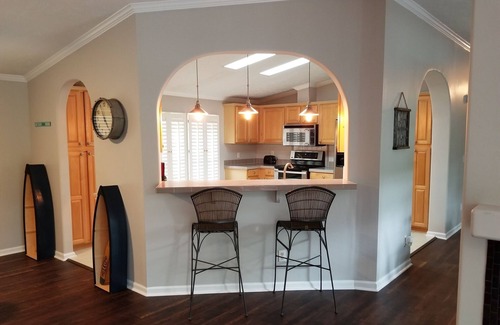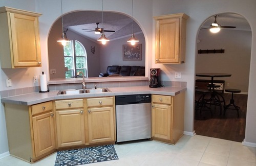 At the Hideaway, there are plenty of areas for people to congregate whether it be at our new double slip dock, on our two-tiered back deck, or at the the beautiful fire pit table. Inside there is the awesome reclining sectional in the living room (four recliners!) as well as the pub table or the dining room table. We have 3 dining areas inside and there is a double-sided fireplace partly separating the dining and living room for the colder months. We have a huge circular cement driveway with plenty of room for a trailer and multiple cars/SUVs. We have a fully stocked kitchen for cooking and entertaining. We have Dish TV, and AT&T Wi-Fi. There are three TV's: one in the living room, and one in each of the two rooms with the king beds.