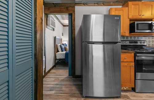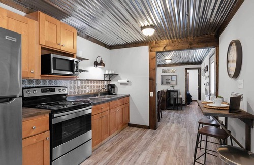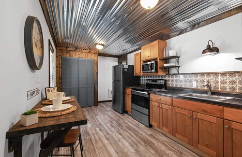 Hideaway Resort is located on the James River arm of Table Rock Lake between points 11 and 12. Although the resort is not located in Branson, you are just a 35 minute drive away from everything the area has to offer. Lake Life Cabin, #1, has been recently remodeled and has amazing views of the lake - right across the street! The living room has plenty of seating for everyone in the cabin. One of the two couches is a queen size sleeper sofa. Additionally, there is a perfect table for a snack or drinks behind the couch. Just past the large flat screen TV is the covered deck with seating for all! You won't find a better lake view than this. Walk to the resort pool or across the street to the resort dock. This units charcoal is just down the deck steps. The large kitchen, just off the living room has plenty of room for everyone to be involved in meal preperation. With new stainless steel appliances there is everything you need to make your families favorite lake meal. The kitchen also has a small brekfast bar, or drink station - you choose!