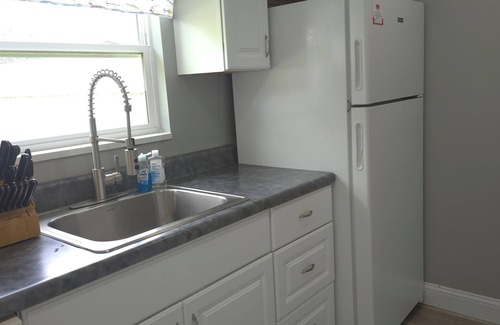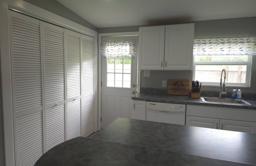Angler's Retreat features two bedrooms and one full bathroom with a tub and shower. One bedroom features a queen size bed with an attached entry/outdoor view of the yard. Bedroom 2 has three twin size beds in the room with all linens provided. The kitchen and laundry area are fully stocked with everything you need to enjoy your stay.