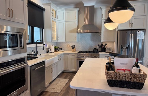 Featuring indoor and outdoor table seating for 10, a stocked kitchen, and a downstairs bar with an additional refrigerator to store drinks and extra food.