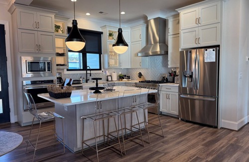 Escape to a soothing 5-bedroom house in Seneca. With 4 king beds and 1 queen bed, this retreat offers a peaceful ambiance for guests. New construction craftsman-style home on beautiful Lake Keowee. Enjoy an exclusive getaway with room for the entire family. Built on a flat lot situated steps away from Keowee's pristine waters.