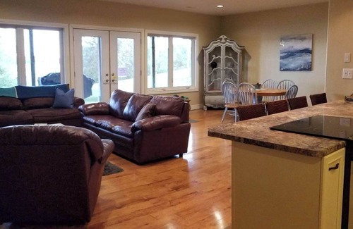 Welcome to our Lakehouse! Enjoy your Escape to the Lake while staying in our 2000 sq ft walk out basement apartment with beautiful views! Your 3 bedroom 1 bathroom open concept accommodations offer you a spacious spot to socialize after having spent the day swimming, fishing or lounging on the dock/deck. Pick blueberries or take nature walks by day then listen to the loons while roasting marshmallows in the summer. Our night sky is perfect for stargazing all year long too!