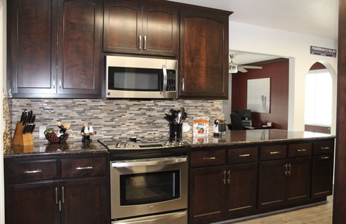 Back Deck has a screened in patio area with comfortable outdoor furniture for relaxing. Great for the months where mosquitos are out. A large custom BBQ island with a gas BBQ, side burner, sink (rinsing only, no food down drain), mini fridge and bar stools for the BBQ island. A table, chairs, and umbrella to enjoy eating, playing games or just relaxing at. Along with a nice cozy area with an extra-large umbrella to kick back on comfortable outdoor furniture to enjoy a cup of coffee in the mornings, chill and read a book, enjoy looking at the nature around you and a fire pit table to light in the evenings. Plenty of room in the house for everyone when you are done enjoying the outside.