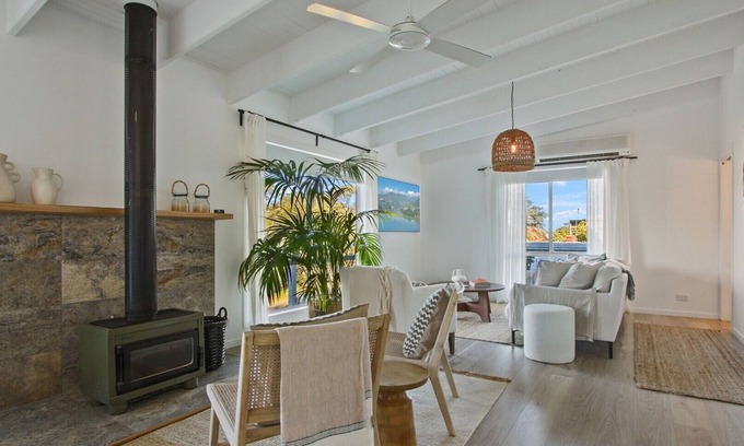 Lake Metung is a newly renovated, two-story retreat located on Beach Road in Metung, directly across from Lake King. This spacious property features four bedrooms, accommodating up to ten guests. The open-concept living area seamlessly integrates the living, dining, and kitchen spaces, leading to two balconies with breathtaking views. Amenities include a fully equipped kitchen with a coffee pod machine, two bathrooms, laundry facilities, free WiFi, and a smart TV. Outdoor features comprise an entertaining area with a BBQ, a fire pit, and access to kayaks and paddleboards for use at guests' own risk. The property is within a short walk to Metung Township and offers driveway parking for two vehicles. Please note, pets are not accepted, and smoking indoors is strictly prohibited.