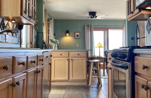 There’s a lovey & comfortable living room overlooking the lake with a fireplace and flatscreen TV. There’s also a spacious family room off the kitchen with two daybeds set up for lounging or TV watching, and a spacious dining table for 8, a workspace with phone and desk lamp, and a 2nd TV. Satellite WiFi is great for emails and texting. A landline with free long distance ensures you can stay in touch even if your cell phone has a poor signal.