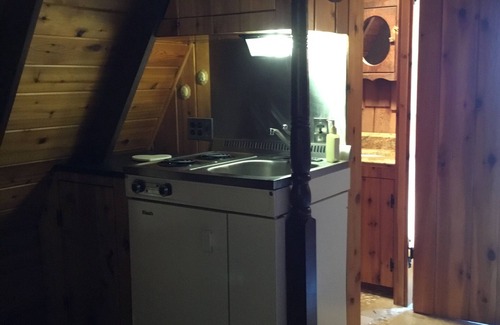 Inside, it is an efficiency-type with tumbled marble floor, electric heat, a Queen Anne futon that makes into a very comfortable double bed, a combination sink-stove-refrigerator/freezer unit, and kitchen area. There is a half-bath with built in vanity and granite counter top and an attached classy stone and timber private hot outdoor two-person shower.