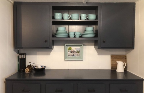 The kitchen is fully equipped with a gas range, full size fridge, microwave, coffee pot, Keurig coffee machine, and dishwasher.