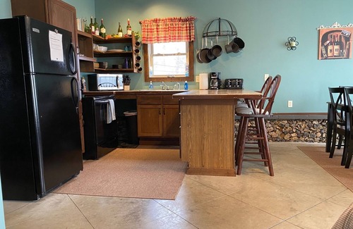 As you enter the cabin, you'll get a very strong unlimited free WIFI signal and find the large multi-use room which serves as the second bedroom. Here you'll find 2 twin beds, a comfy leather sofa, 2 recliners and a 48" HDTV powered by DirecTV.