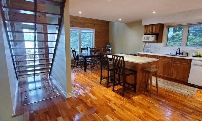 The Chalet is finished with gorgeous cherry hardwood floors and has a loft with 18ft ceilings and a commanding view of the water. Twokayaks, acanoe and Stand Up Paddle boardare included with the rental.
