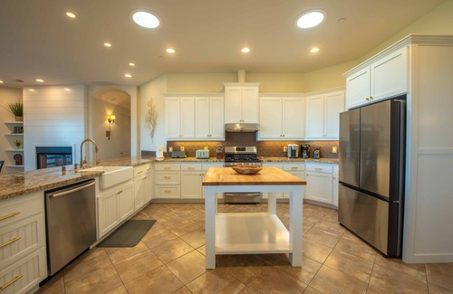 Well-stocked gourmet kitchen with large oven, 5-burner stove, microwave, Keurig and drip coffee makers. Plenty of counter space with 6 bar stools, kitchen table with seating for 6 and dining room table seating for 12, allows plenty of room for everyone. Enjoy a cozy fire while dining in the spacious dining room. Reverse Osmosis (RO) water and whole house water filtration runs throughout.