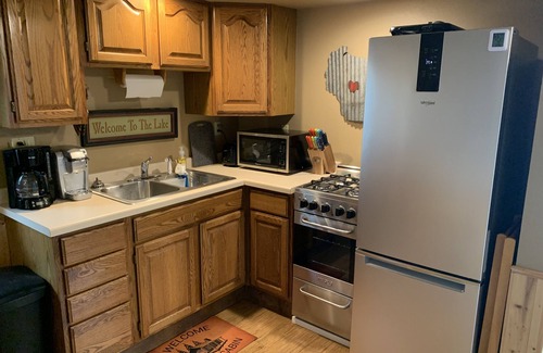 Step outside and you will find a private deck with a charcoal grill as well as furniture to sit and relax while looking out onto the lake. Off the deck is a picnic table for outdoor eating as well as a campfire ring with Adirondack chairs for nighttime campfire stories and smores!