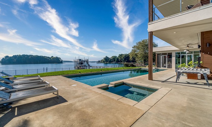 Super modern lake house on Lake Norman with sunrise views for miles and beautiful spa and pool with every luxury imaginable. This home is located just beyond the Point and the Trump golf course which puts it close to everywhere you want to be on Lake Norman.