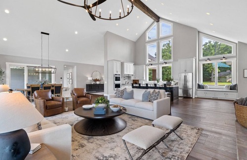Designer-furnished lakefront estate on a massive private lot with sweeping views of Lake Oconee. With 7 king suites —each with ensuite baths—every guest has their own retreat. Spend days paddling kayaks or SUPs, lounging on expansive decks, or playing corn hole on the lawn. Evenings bring grilling at sunset, gathering in the basement lounge for a game of pool, or relaxing on the oversized dock. Chef’s kitchen, fast Wi-Fi, and two living rooms make it effortless.
