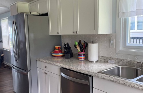 The kitchen has been recently updated with stainless steel appliances. It is fully equipped with pots, pans, silverware, bowls, utensils, coffee pot, blender and toaster. There is also an outside gas grill.
