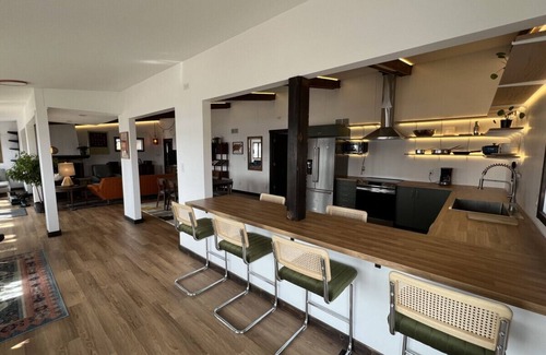The 1700 square foot space features a large open floor plan with exposed beams, a huge kitchen with eat-in breakfast bar, and a large dining table -- a perfect spot for entertaining, hosting wedding dinners, or anything else!