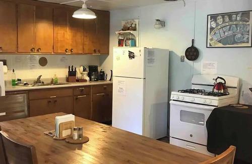 The co-op kitchen is a stone's throw from our cabin for all cooking needs. Shared Fridge, Mini-oven, 4 gas burners, oven and all kitchenware. All utensils, cookware, dish and cleaning supplies. Coffee maker and beans with grinder- as well. This is a shared space with table seating 7ppl. Other guests will be using facilities, so we ask that everyone be considerate and clean. Only item that we ask you to bring is Ice for coolers. We do not provide ice for guests on site.