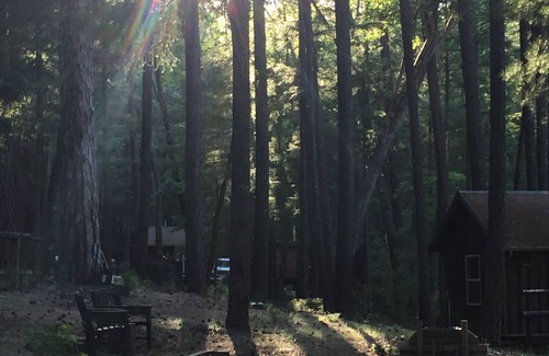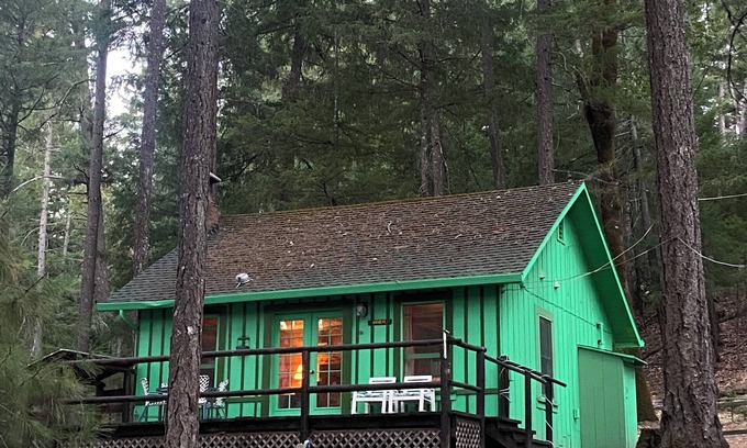 A beautiful rustic studio cabin set amongst pine, fir and oak trees.