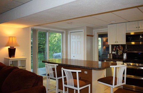 Ground level walkout with access to Wolf Lake. Access to a dock and swimming area. The rental has full kitchen, walk in shower, laundry room, two bedrooms, and full living room. The area is approximately 900 square feet with tile floor. The area is close to Lake Michigan and multiple retail establishments for shopping. There is a small paved area for viewing the lake and a fire pit. The area is quiet with natural wildlife all around the lake. The owners of the home reside in the upper area of the home with two dogs. One dog is a chocolate lab and the other is a black lab mix. The dogs are well trained and will be kept under control as much or as little as the renter desires.