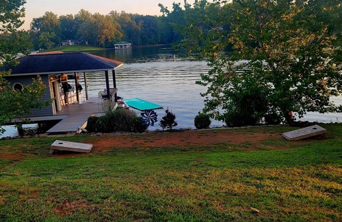 Enjoy wide water views from hot tub,deck or gazebo or roast marshmallows around the firepit or enjoy a game of corn hole. There is something for everyone at this Lake Retreat. Deep water great for fishing from your dock. Also great cove for swimming, tubing and all your water fun! There is also a basketball hoop to enjoy. Kitchen is stocked with everything needed, Blackstone grill under gazebo.Master suite has huge walk in shower with large bathroom and double vanity. Covered boat dock with swing. Lots of places to enjoy at this Lake Retreat.