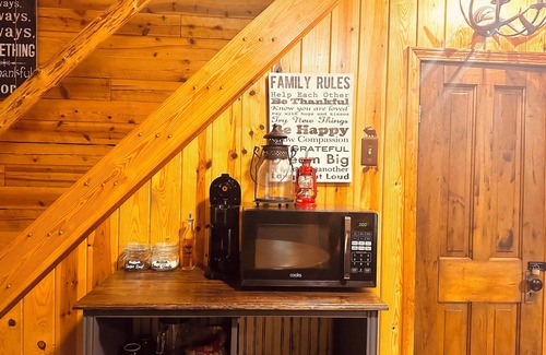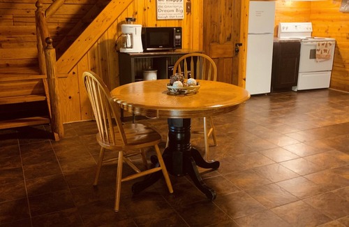 This spacious cabin has a open layout for the kitchen, dining room and living room.Theroomy, bedroom loft is located upstairs and has two comfortable, queen sized beds.The cabin also has a couch and a set of twin bunk beds that help it sleep seven comfortably. Refrigerator, stove, microwave, coffee maker and blender are just a few of the amenities included in the kitchen.The dining area includes a small bar and a dining table.There is a washer and dryer in the laundry area.