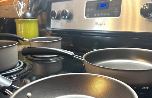 The four bedroom cabin has a modern kitchen with microwave, stainless steel full-size refrigerator, dishwasher, stove, toaster, coffee maker and oven. The kitchen is stocked with pots & pans and cooking utensils. This cabin also has modern bathrooms plus central heating and air. Bedding and towels provided. Master bedroom has a king sized bed. Second bedroom has a queen sized bed, the third bedroom has a full-sized bed, and the fourth bedroom has a twin trundle bed.