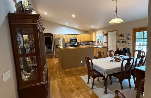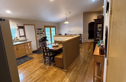 2600 sq ft of single level living. This home has 4 bedrooms, an exercise room, full kitchen, pantry, breakfast eating area, dining room, multipurpose room and living room with a wood burning stove. The home is meant for living and enjoying. There are kids toys, board games, books, videos and outdoor games. The kitchen has plenty of cookware, dishes, glassware, some spices, other amenities and a Keurig coffee maker with coffee available. There is a front porch and a back deck with a bbq. There are maple, cedar and pine trees circling the property, a large grassy yard and trails that lead to Covington Creek.