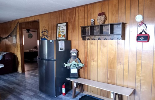 Outside fenced yard with basic Weber charcoal grill, table for 4 & umbrella. Fenced area perfect to set up Fish Fryers for catch of the day. (Cleaning fish has to be completed at dock). All the comforts of home, full stocked kitchen for your getaway.