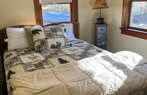 Bring your kayaks or motor boat. A 2-bedroom cabin that can sleep a maximum of 4 people. Has a kitchen, dining area, family room and bathroom all on one level. Great location for fishing or just enjoying lake life. A small beach is on site and dock space is available for your boat.