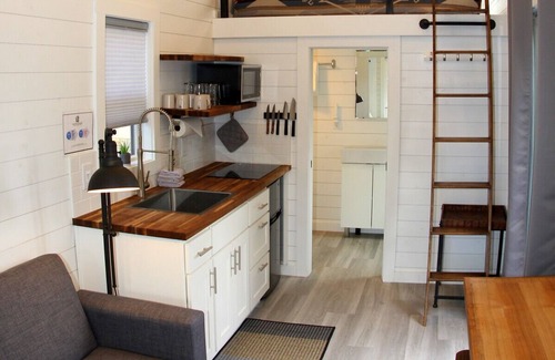 Experience our exclusive lodging, and stay in one of our luxury tiny homes! This spacious, 200-square-foot open-concept unit features a full-sized Murphy bed with comfortable sleeping for two and a 69-square-foot loft with a king-sized bed. Both mattresses are 100% organic latex and covered with high-end linens, pillows, and wool Pendleton blankets for those crisp, high desert nights under the stars. There is also a full-sized futon for extra guests featuring linens upon request.
