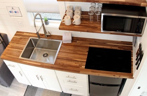 This unit has essential cooking items supplied for you. The added feature of this tiny home is the private hot tub off your private deck. Remember to take advantage of pontoon boat rentals, SUP, and kayaking boat rentals.