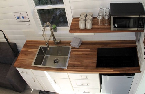 Experience our exclusive lodging, and stay in one of our luxury tiny homes! This spacious, 200-square-foot open-concept unit features a full-sized Murphy bed with comfortable sleeping for two and a 69-square-foot loft with a king-sized bed. Both mattresses are 100% organic latex and covered with high-end linens, pillows, and wool. Pendleton blankets for those crisp, high desert nights under the stars. There is also a full-sized futon for extra guests featuring linens upon request.