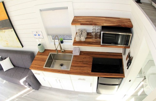 Experience our exclusive lodging and stay in one of our luxury tiny homes! This spacious, 200-square-foot unit features a queen-sized bed with comfortable sleeping for two in a private bedroom and a loft with a twin-sized bed. Both mattresses are made of 100% organic latex and covered with high-end linens, pillows, and wool Pendleton blankets for those crisp, high desert nights in the stars. There is also a full-sized futon for extra guests featuring linens upon request.