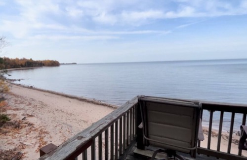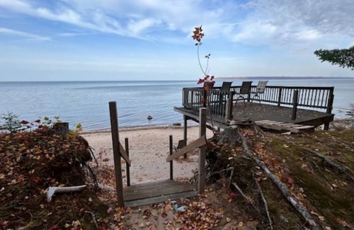 3.5 Bedroom/2 bathroom home is a new listing on site, located directly on the water. Has huge waterfront deck as well as deck overlooking the water. Mostly all new interior. The beach has a gentle 5ft bank with new stairs to the beach. Beach is mostly sand with some rocks, but this changes every year. This rental is located directly next to our other rental, so if you have larger groups you may be able to rent both beachfront houses if available at once.