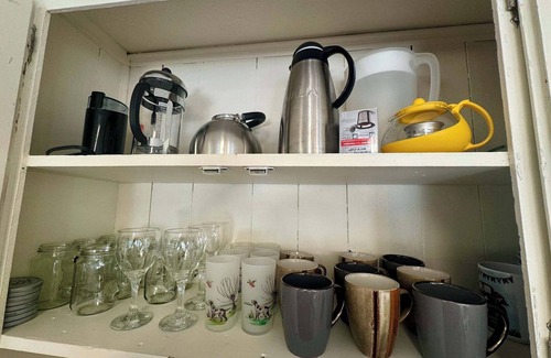 Two comfy bedrooms, each with a full bed, ceiling fan, individual AC unit, and black-out curtains could be your best sleep ever. The bath features a walk-in shower, bidet, hair dryer, and wall fan, and is supplied with soap, shampoo, conditioner, towels, and toilet paper for your convenience. The living room, dining room, and kitchen are all connected with an open floor plan and two sliding glass doors, so the lake is always in view. Plenty of comfortable seating in the living room for watching TV, including an oversized recliner for an afternoon nap or for a good book from our bookshelf. There's also a DVD player and a collection of classic movies. The dining table seats six with plenty of room for a big meal or for a game or jigsaw puzzle from our collection. The kitchen is fully equipped with plates, cups, glassware, silverware, cookware, tea kettle, coffee maker, Keurig, French press, electric griddle, smoothie blender, and crock pot. The cottage has a large deck for enjoying the view, with seating, a coffee table, and an electric fan. There's also covered parking in the cottage's pole barn. The cottage is just a mile from the boat ramp, coin laundry, and bait and convenience store at Ingram's Marina.