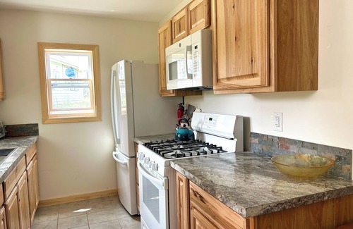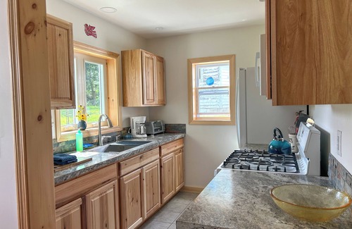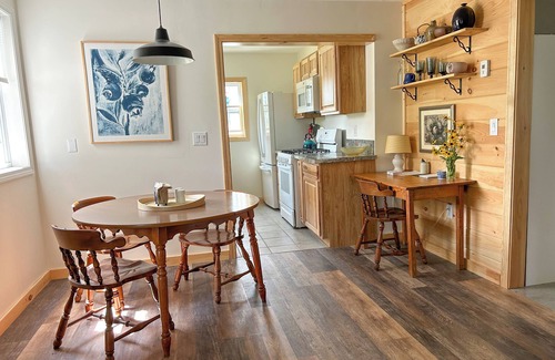 This newly renovated cottage with a separate bunkhouse is a great spot for family and friends to gather. The main house has an open-concept living area containing: the living room with a pull-out sofa, the dining area with seating for four, and the galley kitchen with a gas stove, microwave, toaster oven, blender, and coffee maker. The main bedroom has a queen-sized bed and dresser. There is one bathroom in the main house and it has a walk-in shower. There is a washer and dryer. The bunkhouse is detached from the main house. It has a bunkbed that contains a full-sized bed on the bottom bunk and a twin-sized bed on the top bunk and two dressers.
