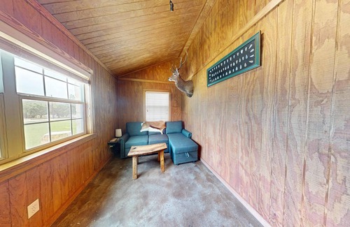 Escape to our 2 bedroom / 1 bath cabin, located within the picturesque surroundings of our Texas hunt lodge. Enjoy stunning views of the tranquil lake from your private deck, or take a stroll down to the water's edge and dip your toes in the refreshing water.