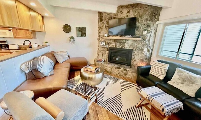 The condo is well-appointed with all the modern amenities you need for a comfortable stay. Revel in the cozy living space featuring hardwood floors and a fieldstone gas fireplace, perfect for intimate gatherings. The fully equipped kitchen allows you to prepare meals for friends and family, while the three spacious bedrooms—each with comfortable queen beds and one with a twin trundle—ensure everyone gets a restful night’s sleep. Enjoy access to a hot tub and sauna in the adjacent building (currently closed due to COVID) to unwind after wedding festivities, and take advantage of Wi-Fi, smart TVs, and laundry facilities for added convenience.