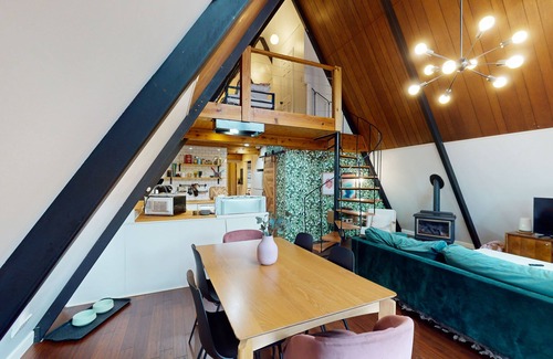 This cozy retreat is both charming and adventurous, featuring high ceilings that create a spacious yet inviting atmosphere. The main living space includes a stylish dining area, and a fully equipped kitchen. The cabin surprises with its compact yet functional layout. Downstairs, a comfortable bedroom offers soft bedding for a restful night's sleep, while upstairs, a second bedroom awaits up the spiral stairs.