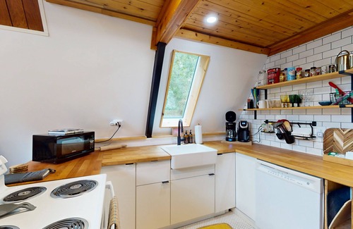 The Lost Haus, under new ownership and recently remodeled, is a charming A-frame retreat blending minimalist and modern décor. Relax in the insanely comfortable egg chair or curl up on the velvet couch for ultimate relaxation.