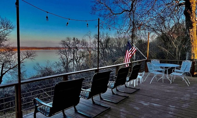 How do we describe the Lakeview Cottage? Secluded, Peaceful, Serene, Scenic, Quiet, Beautiful, Amazing view, and more. The house is on the side of a mountain, with a large deck overlooking Fort Gibson Lake. When you stay here you will likely see Bald Eagles, White Tail Deer, and a variety of other wildlife. It is about one hundred yards to the lake, but you need good knees and a strong heart to make the hike to the Lake. You can hike to the lake and fish, and you will have a whole mountain you can explore. Wahoo Bay and Sequoya are only two miles away where you can put you boat or jet skis in the water. However, you will not be able to park your trailer at the cabin. There are several marinas in the area where you can rent Pontoons or jet skis. We are located about 15 minutes from Wagoner and 15 minutes from Muskogee where you will find Wal Mart and many national franchise restaurants at either town.