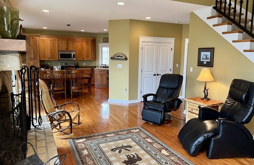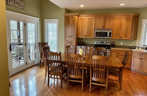 On the main floor is a large family room with a large tv and surround sound. You can enjoy big games or movies with plenty of seating. There is also a sitting area around the stone fireplace. The Kitchen has plenty of space for everyone to enjoy. It has up-to-date stainless steel appliances and is fully equipped. In the Kitchen area, there is a large dining room table to fit twelve and plenty of seating elsewhere. The screened-in porch connects to the dining area, so you can appreciate nature without the insects. The main floor deck is directly outside the large doors and windows. The master bedroom is located on this floor with a full bath. There is also a half bath available for everyone to use.