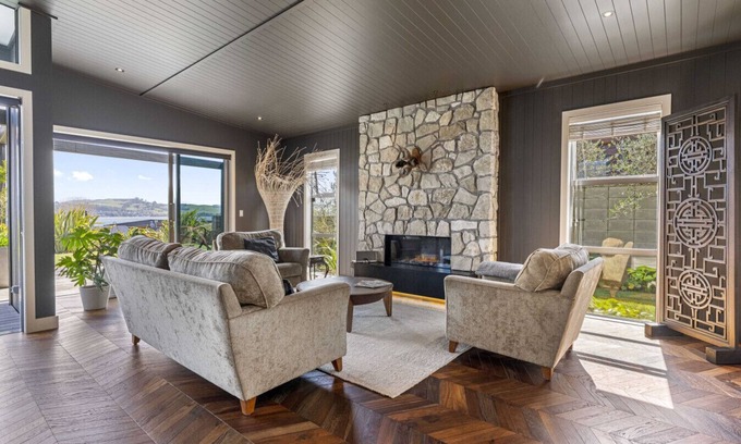 Indulge in opulence, comfort, and breathtaking scenery at this stunning three-bedroom, three-bathroom retreat overlooking the sparkling waters of Lake Taupō.