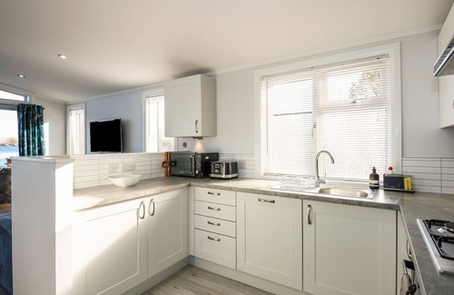 Lake View Lodge, Tallington, Lincolnshire, sleeps four guests in two bedrooms.