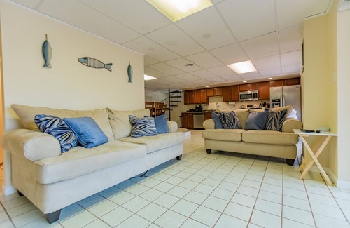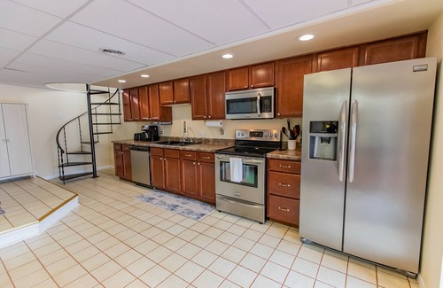 The residence’s main level boasts 3 bedrooms, 1 bathroom, a living room, and convenient coffee station. Head down the fun spiral staircase to the lower level and find the main living areas. An open kitchen set up for preparing and serving full course meals with direct sightlines to the dining and family room areas are an entertainer’s dream, and an additional bath and patio walkout are also found on this floor. Sleeping arrangements comfortably accommodate up to 12 in the following configuration: